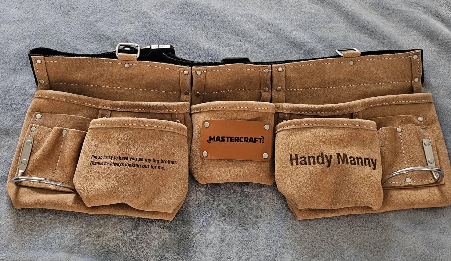 What a fantastic gift for the handy person in your life! This personalized leather tool belt can have your choice of text on one or two pockets and I can also do the middle patch with a simple image or initials. The patch normally has the brand logo on the pocket so I remove the logo then etch what you want. It's a bit of work which is why it costs a bit more.